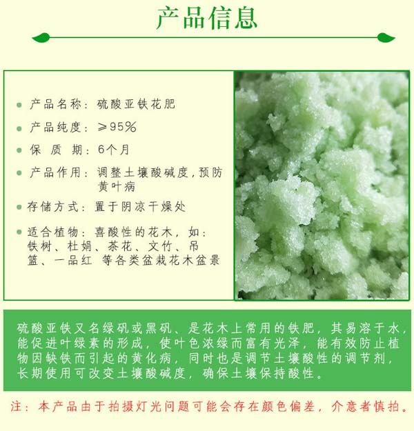 調(diào)節(jié)土壤酸堿度,促使葉綠素形成(亦稱鐵肥),可防治花木因缺鐵而引起的黃化病。是喜酸性花木尤其鐵樹不可缺少的元素。農(nóng)業(yè)上還可用作農(nóng)藥,能防治小麥黑穗病,蘋果和梨的疤痂病、果樹的腐爛病;也可用作肥料,能除去樹干的青苔及地衣。